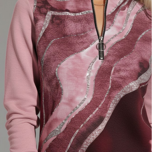 Stylowa damska bluza o prostym kroju, wyróżniająca się eleganckim, abstrakcyjnym wzorem w odcieniach beżu i brązu. Model wyposażony w krótki zamek z ozdobnym pierścieniem, który nadaje całości nowoczesnego charakteru. Wykonana z miękkiego i przyjemnego w dotyku materiału, zapewnia komfort noszenia na co dzień. Doskonałe połączenie wygody i kobiecego stylu.