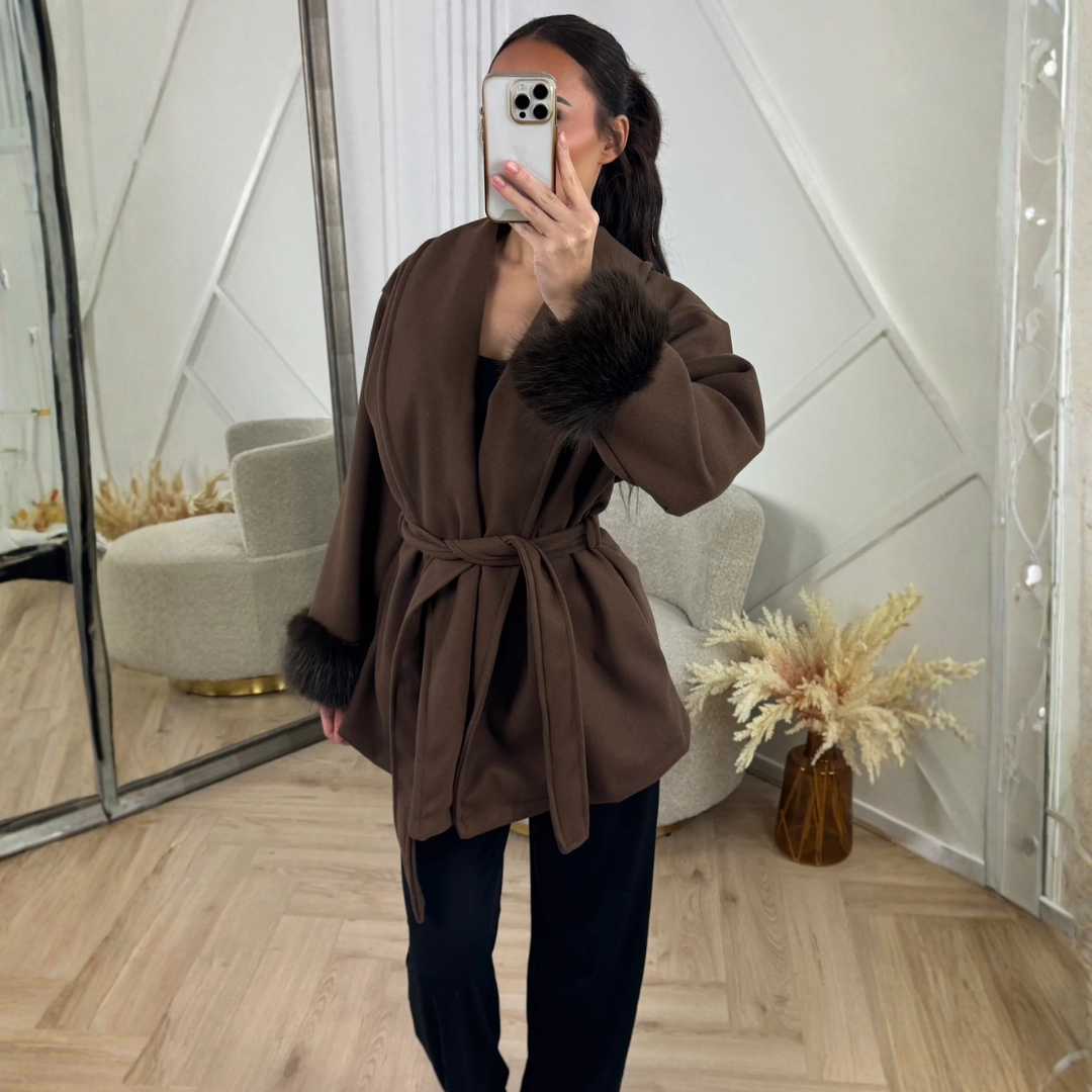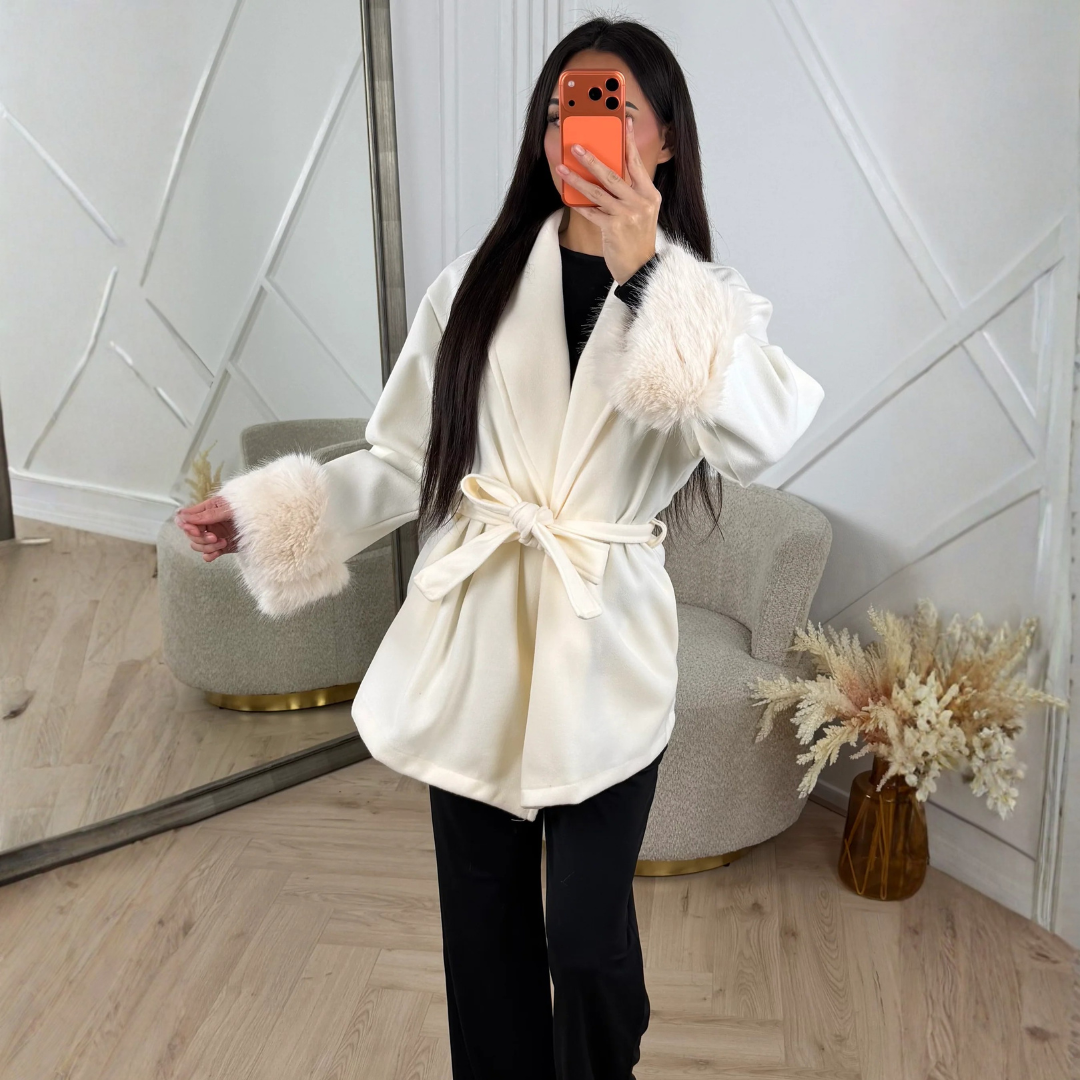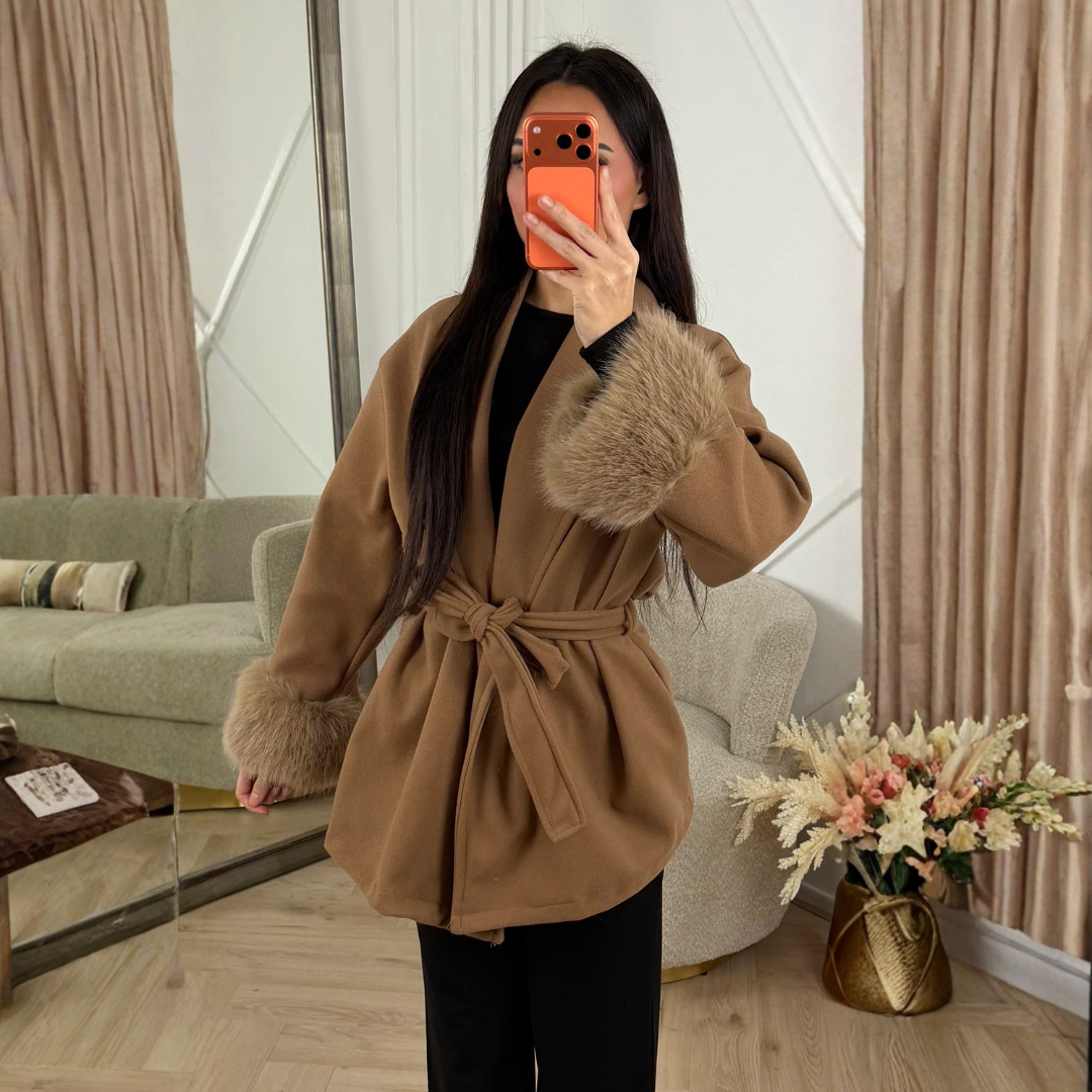 KRYSTYNA | DAMSKI PŁASZCZ Z WIĄZANIEM I FUTRZANYMI MANKIETAMI