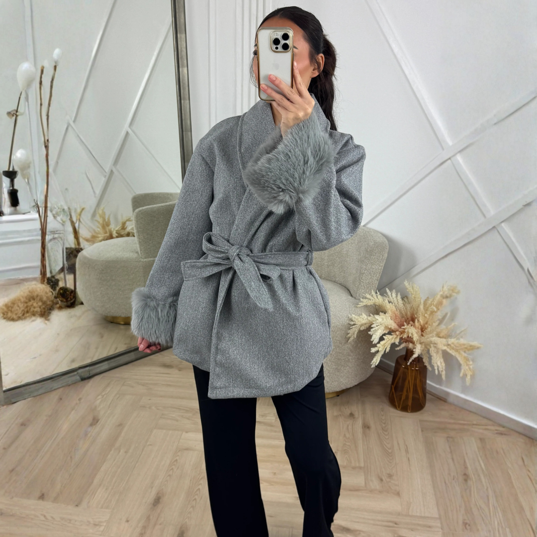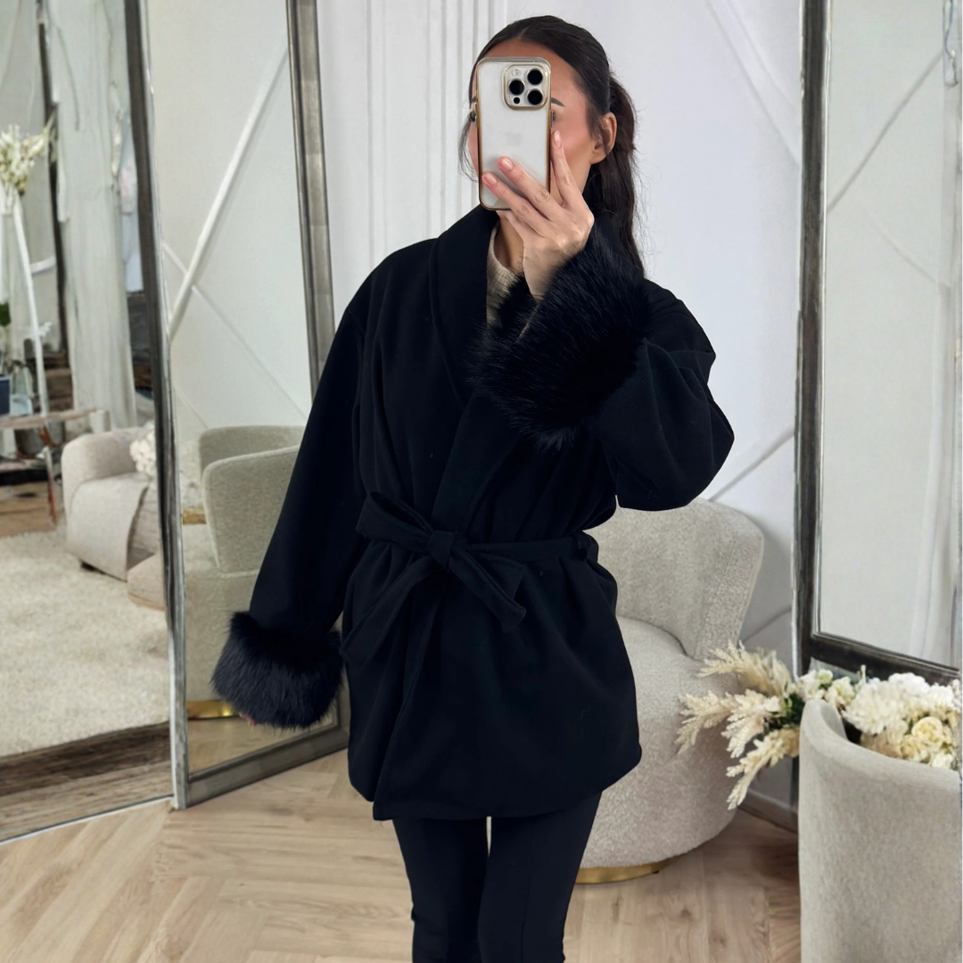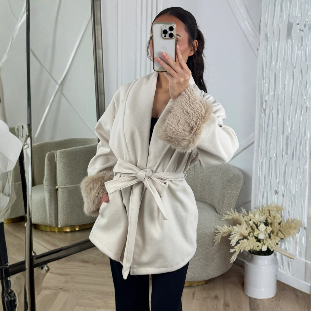KRYSTYNA | DAMSKI PŁASZCZ Z WIĄZANIEM I FUTRZANYMI MANKIETAMI