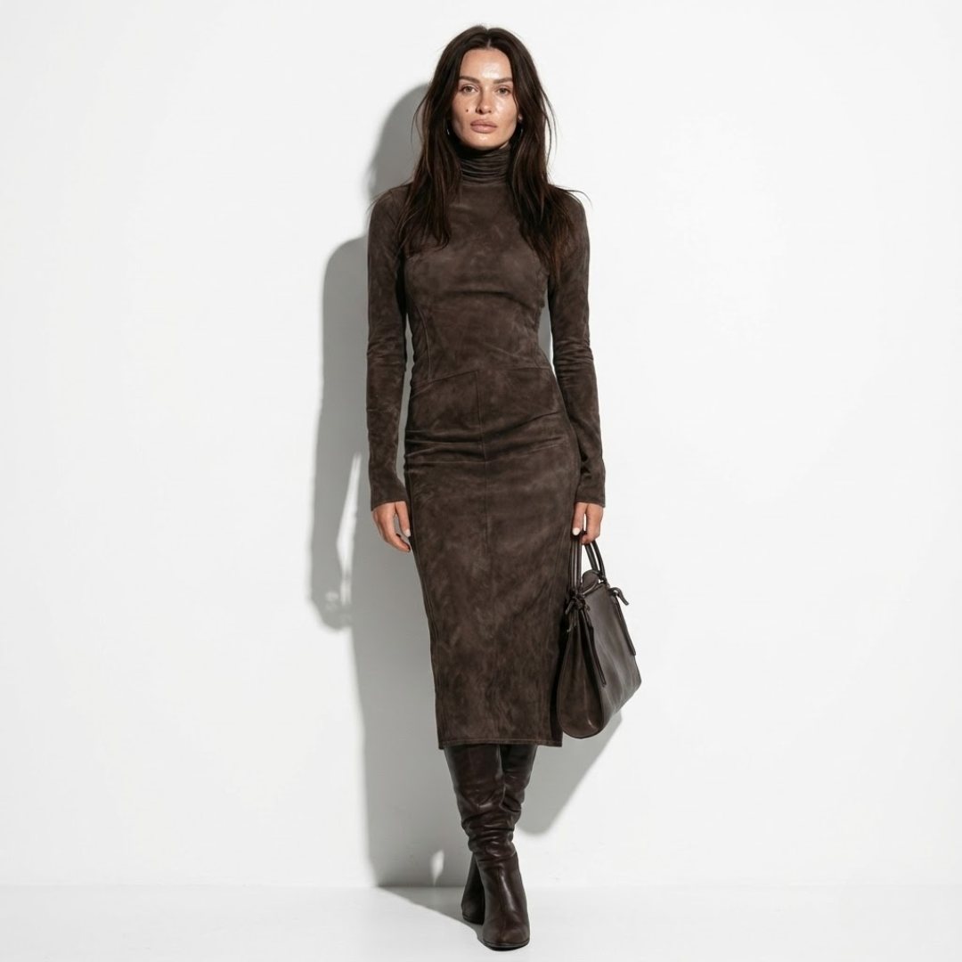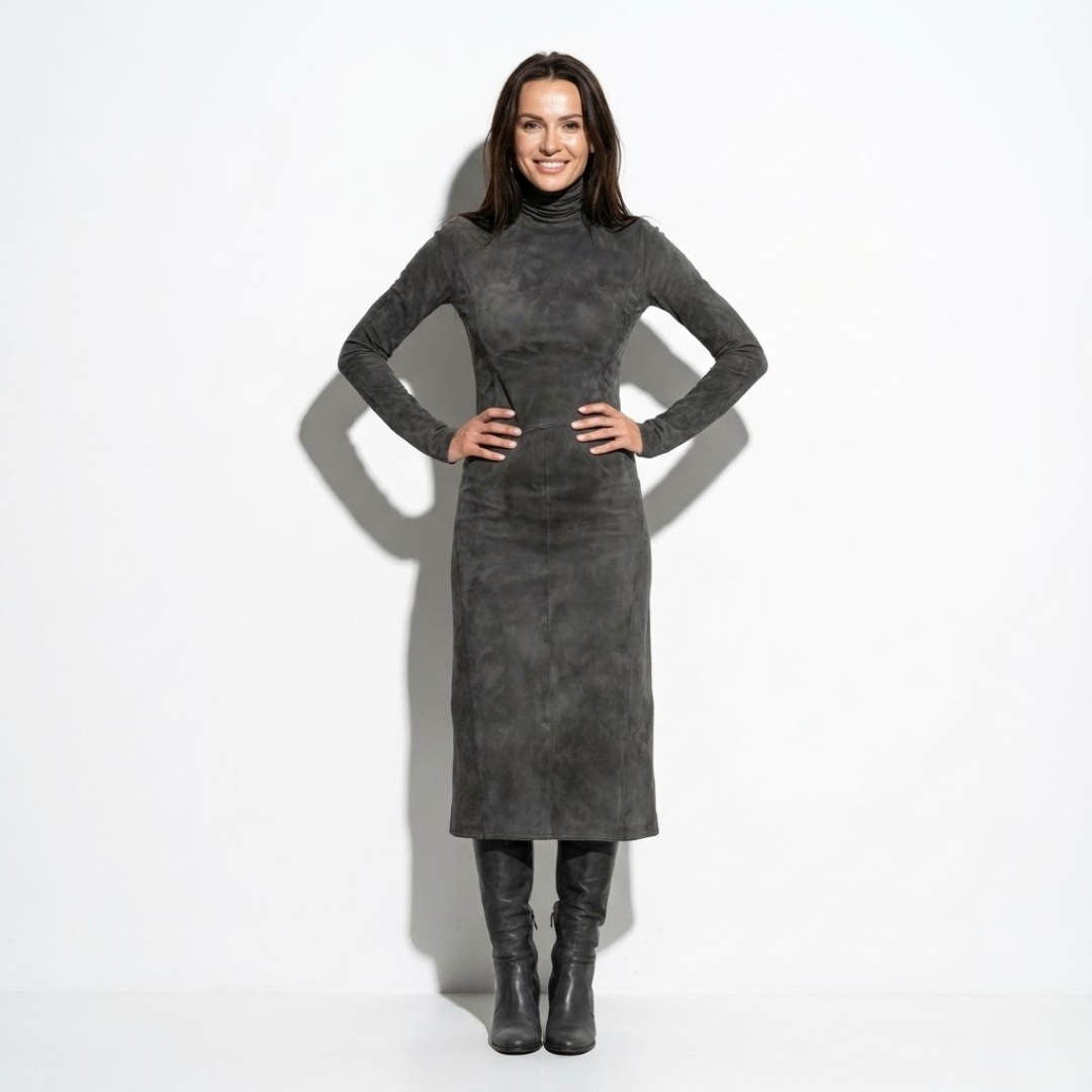 Elegancka damska sukienka midi o dopasowanym kroju, wykonana z miękkiego materiału o zamszowym wykończeniu. Model z długim rękawem i wysokim golfem subtelnie podkreśla sylwetkę, zachowując klasyczny i stonowany charakter. Jednolita kolorystyka oraz gładka struktura materiału nadają sukience ponadczasowej elegancji. Fason zapewnia komfort noszenia i dobrze układa się na ciele.