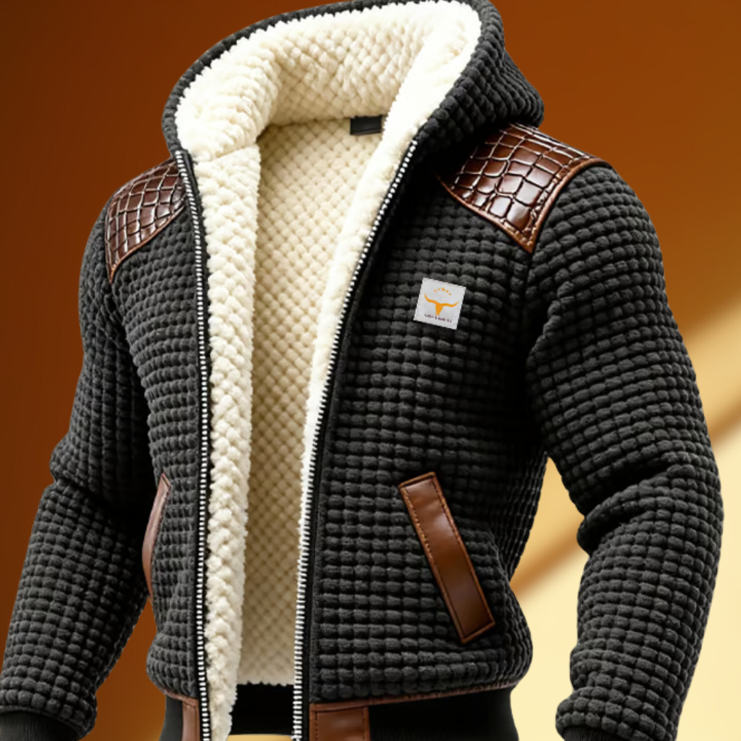 Męska kurtka o ocieplanym, zimowym kroju, wykonana z grubej, teksturowanej dzianiny z miękką, wewnętrzną warstwą imitującą futro. Model posiada pełne zapięcie na zamek, obszerny kaptur, wzmocnienia z materiału o skórzanej fakturze na ramionach oraz kontrastowe wstawki przy kieszeniach. Konstrukcja zapewnia wysoki komfort cieplny i ochronę przed niskimi temperaturami.